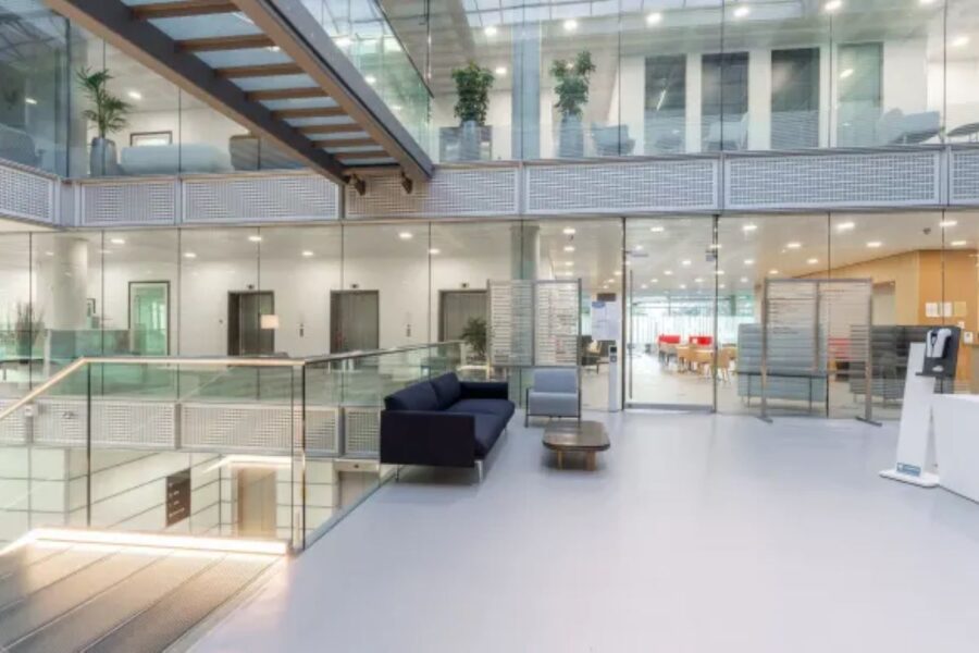 In an innovative office park. Impress clients at this stunning glass business centre in an innovative, award-winning business park with relaxing lake views.